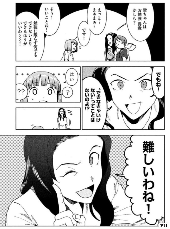 雪ちゃんはお勉強 得意かしら えっと まぁまぁ です そう いいことね 勉強に限らず何でも できないよりできるほうがいいわ でもね できなきゃいけない ってことはないのよ はい フッ 難しいわね 亜人ちゃんは語りたい アル